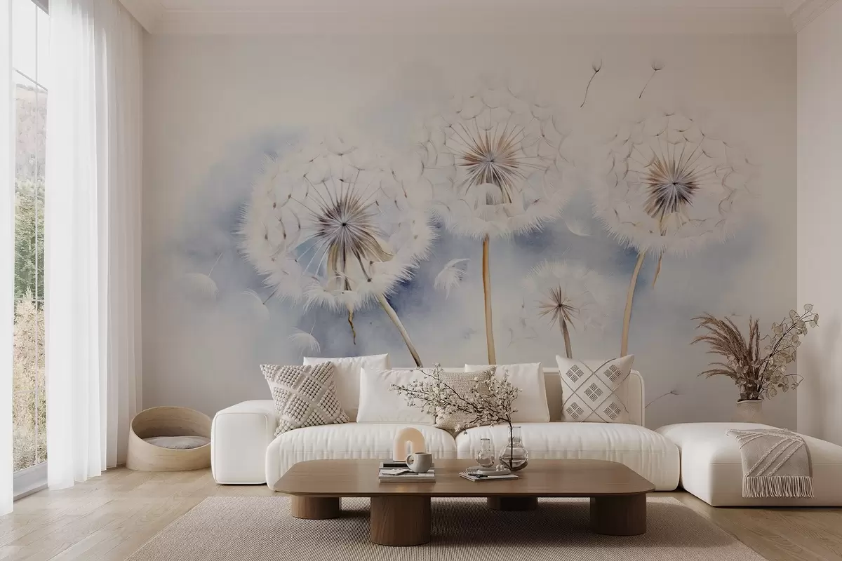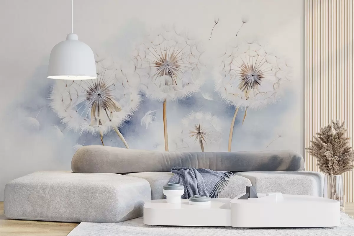 Papier peint Pissenlits texturés avec des graines flottant dans l'air, fond bleu clair et blanc, style de dessin doux et délicat N° w09190