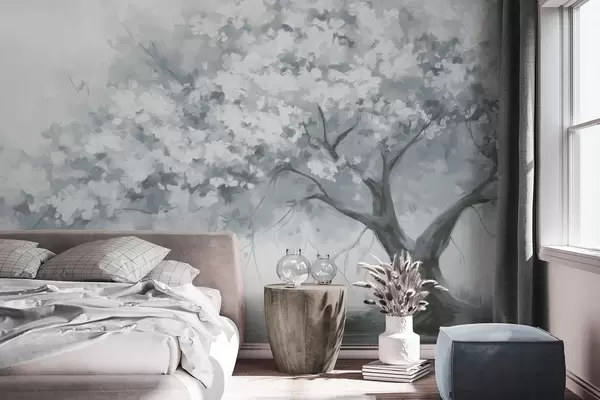 Papier peint Abstrait : arbre en fleurs bleu mat en pleine floraison, près d'une rivière, coups de pinceau doux et texturés et couleurs pastel N° w09193v2