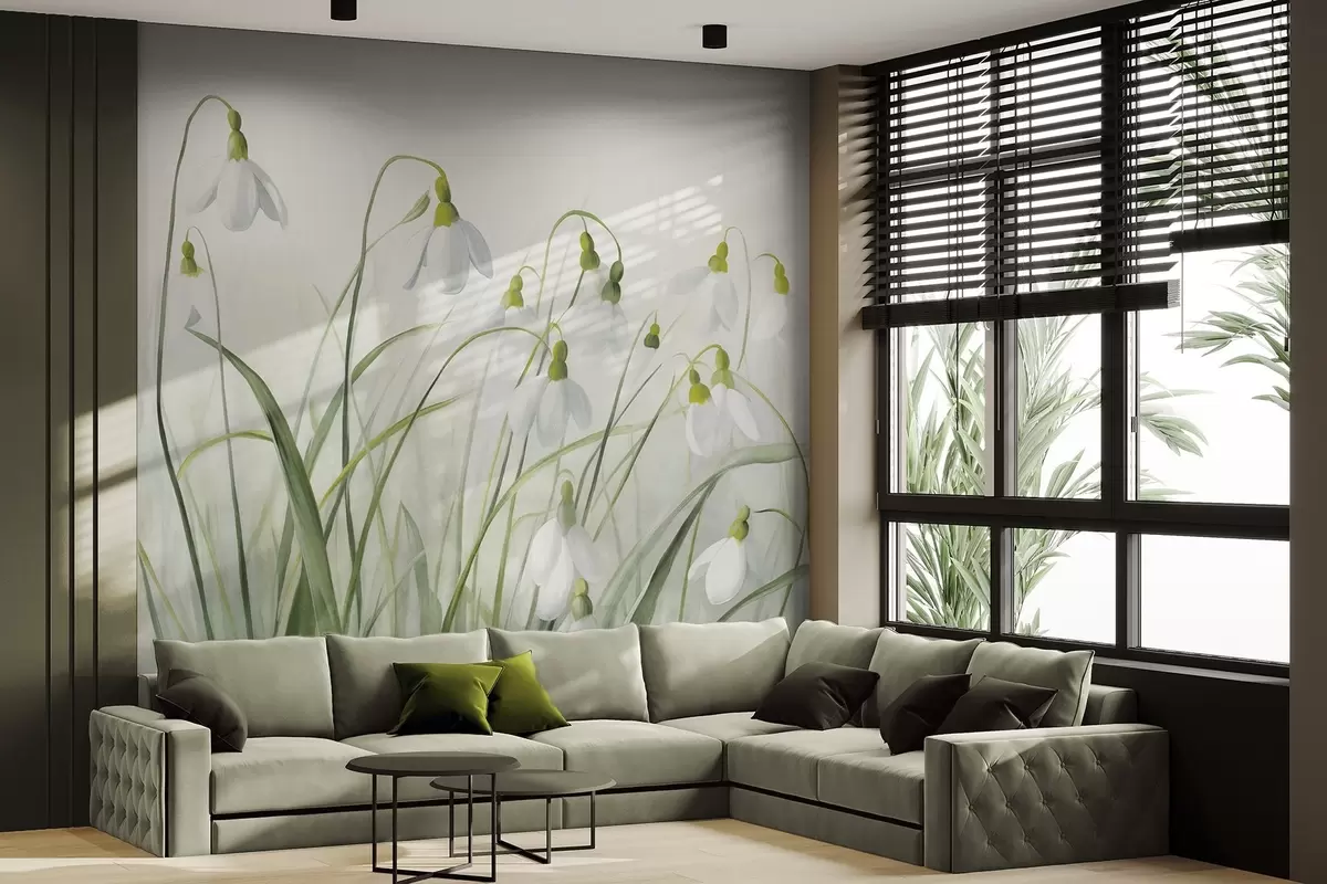 Papier peint Fleurs de perce-neige avec tiges et feuilles vertes texturées, aquarelle de style printanier, coups de pinceau délicats N° w09195