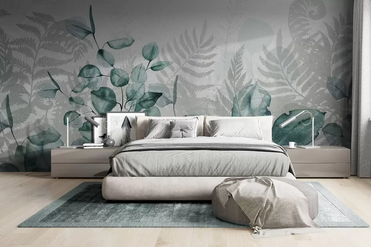 Papier peint Feuilles d'eucalyptus et de fougère dans les tons de vert et de gris, effet aquarelle, illustration botanique N° w09197