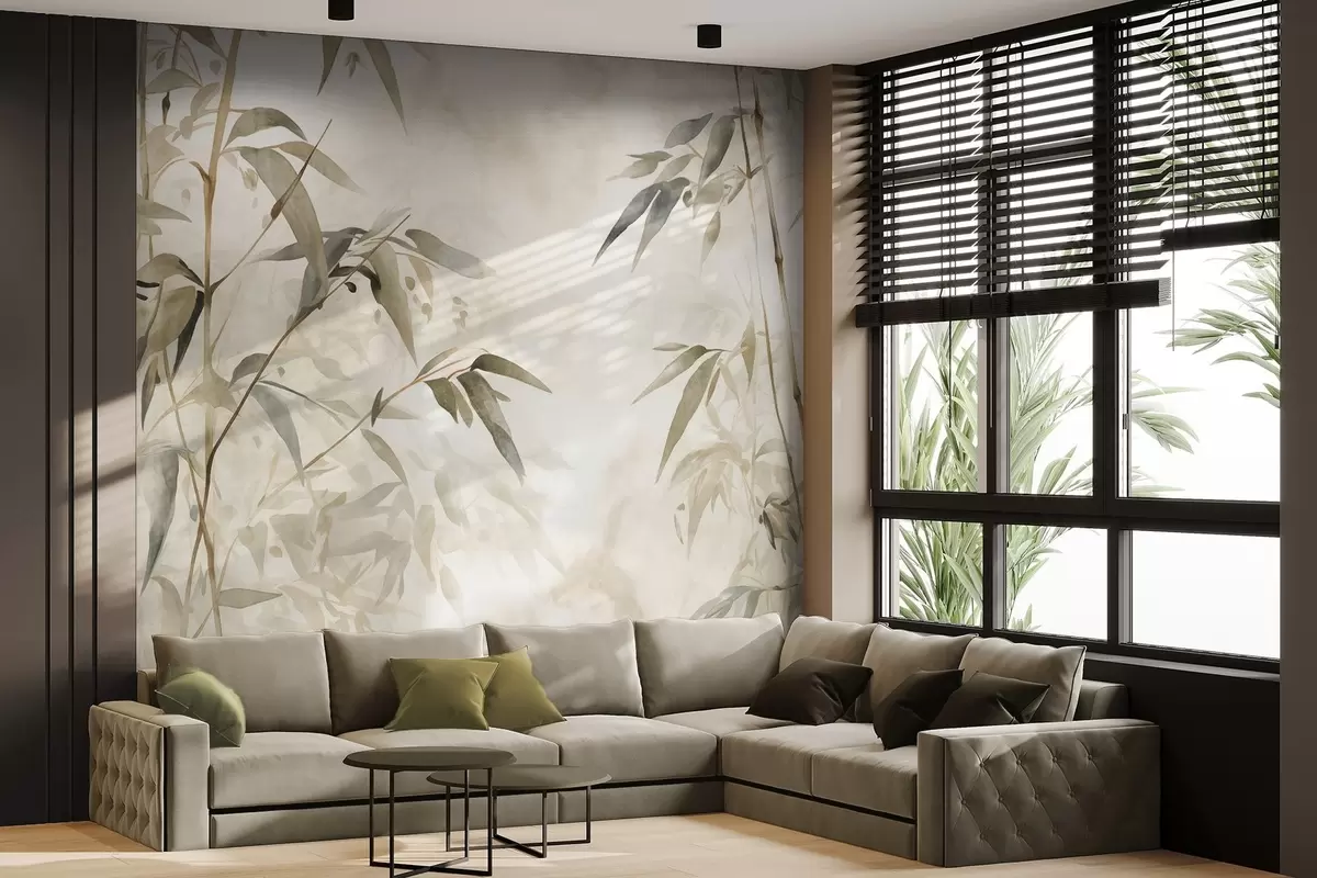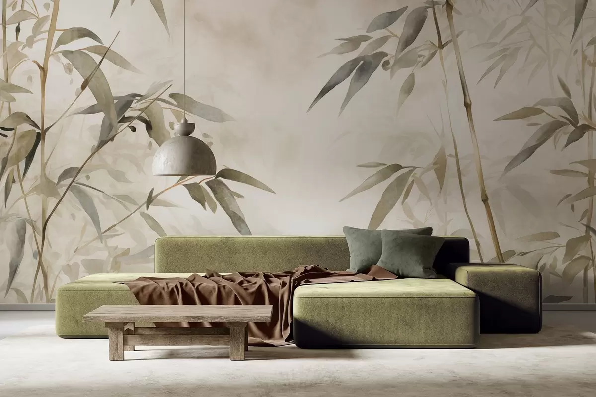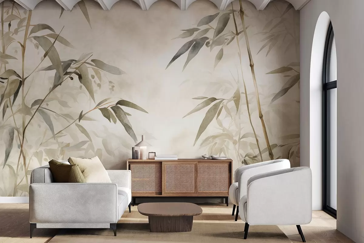 Papier peint Branches de bambou texturées avec des feuilles dans un style aquarelle, palette de couleurs neutres et douces, fond beige clair N° w09204