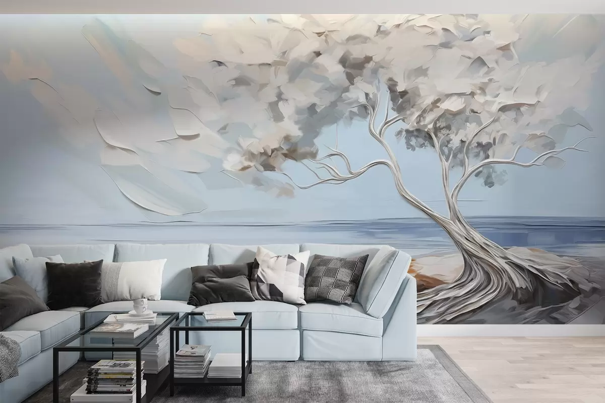 Papier peint Arbre blanc aux feuilles épaisses et texturées sur une plage de sable, paysage avec un ciel bleu clair N° w09205