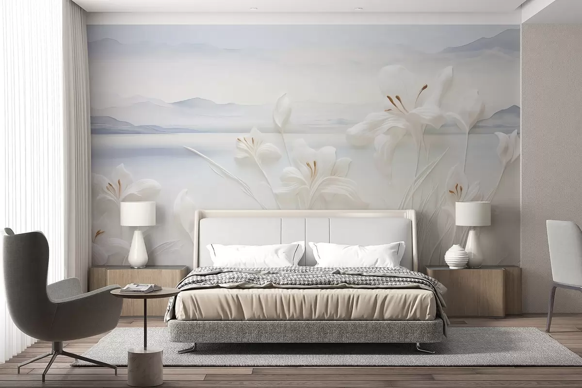 Papier peint Lys blancs à longues tiges et feuilles, montagnes et lac en arrière-plan, composition paysagère minimaliste N° w09206
