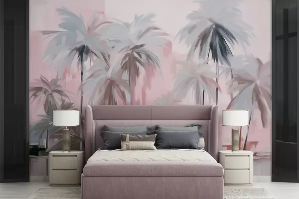 Papier peint Palmiers tropicaux abstraits, minimalistes et pastel, sur un fond de teintes sourdes roses et grises N° w09212v1