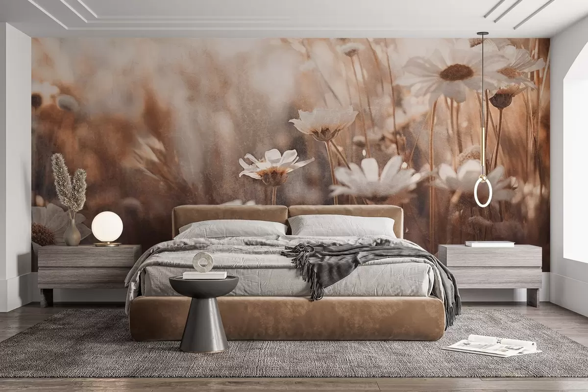 Papier peint Champ texturé de marguerites blanches et de fleurs sauvages dans une palette de couleurs chaudes sur fond flou N° w09214