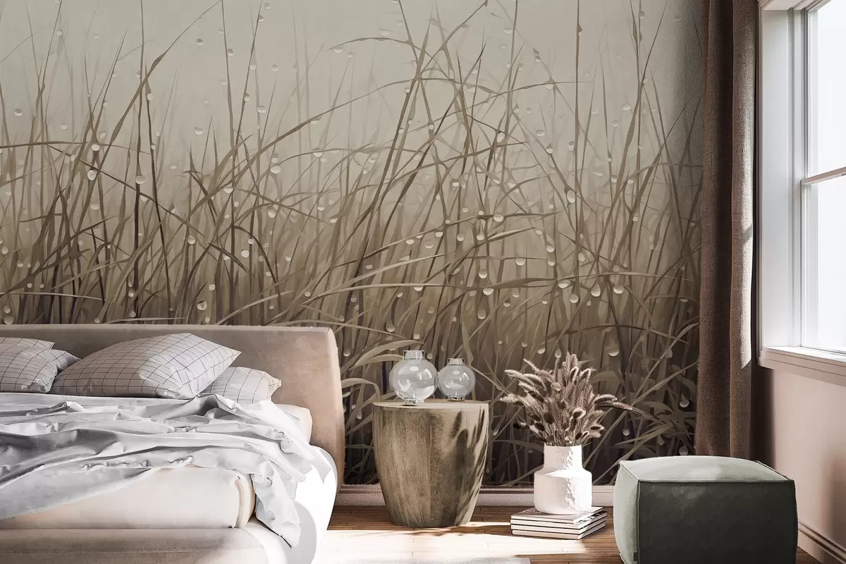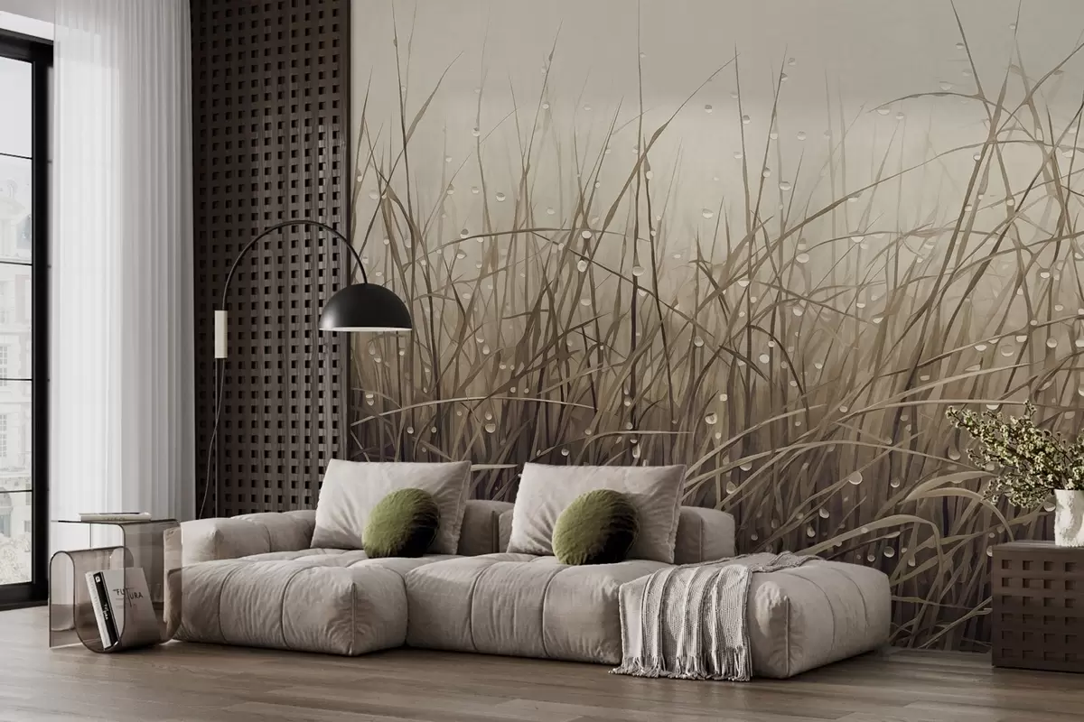 Papier peint Herbe avec gouttes d'eau, tons bruns atténués, lumière douce, arrière-plan brumeux, style abstrait minimaliste texturé N° w09217v1