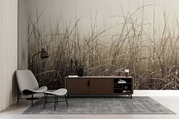 Papier peint Herbe avec gouttes d'eau, tons bruns atténués, lumière douce, arrière-plan brumeux, style abstrait minimaliste texturé N° w09217v1