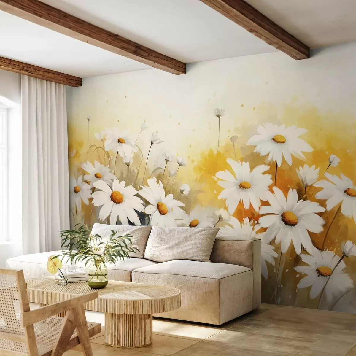 Papier peint Un champ de marguerites blanches avec des centres jaunes, sur un fond jaune et beige doux, style aquarelle  w09218