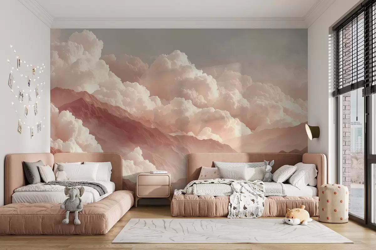 Papier peint Lever de soleil chaud sur les montagnes avec des nuages floconneux N° w09226