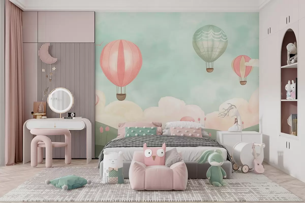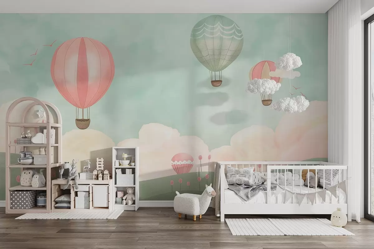 Papier peint Montgolfières au-dessus de collines avec des nuages N° w09228