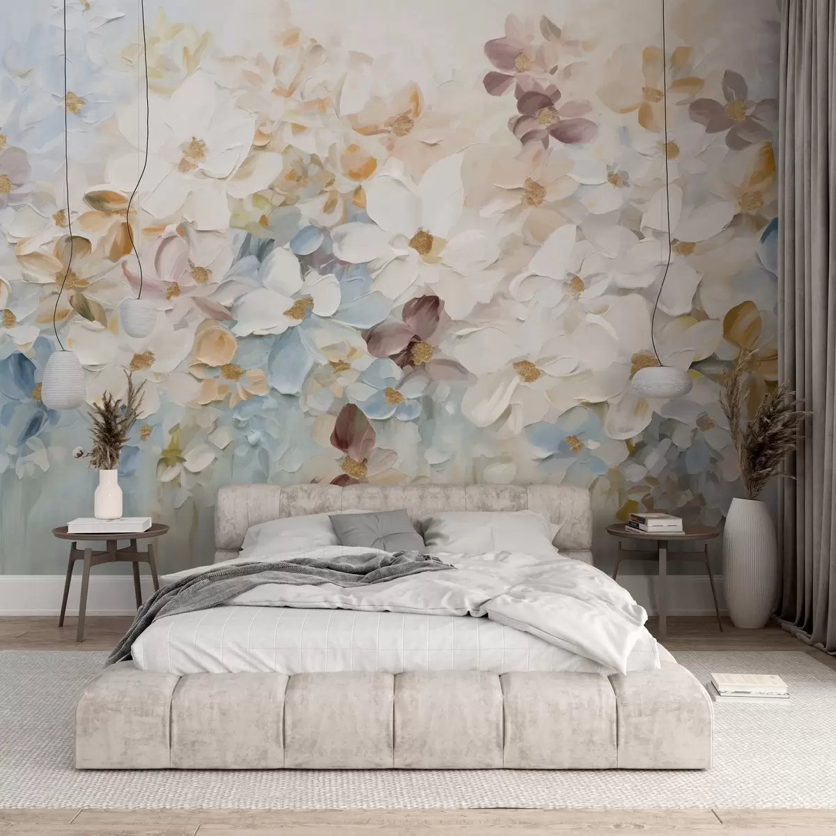 Papier peint Peinture à l'huile imitant un jardin de fleurs avec des fleurs blanches, bleues et orange, coups de pinceau doux, couleurs pastel atténuées N° w09236v1