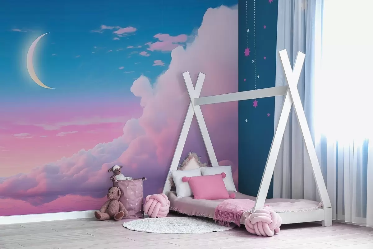 Papier peint Coucher de soleil magique avec nuages et croissant de lune dans les tons roses et bleus N° w09240