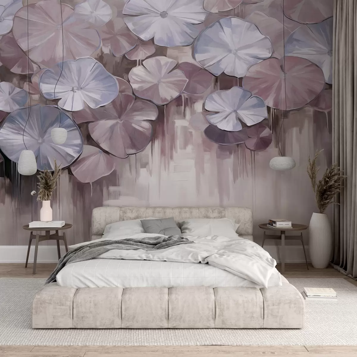 Papier peint Nénuphars texturés aux couleurs violettes et bleues dans un étang, l'arrière-plan est un mélange flou de douces nuances de violet N° w09255v1