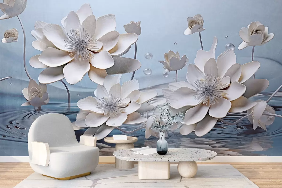 Papier peint Fleurs blanches texturées avec gouttes d'eau, reflets sur la surface de l'eau, fond bleu clair, design élégant N° w09262