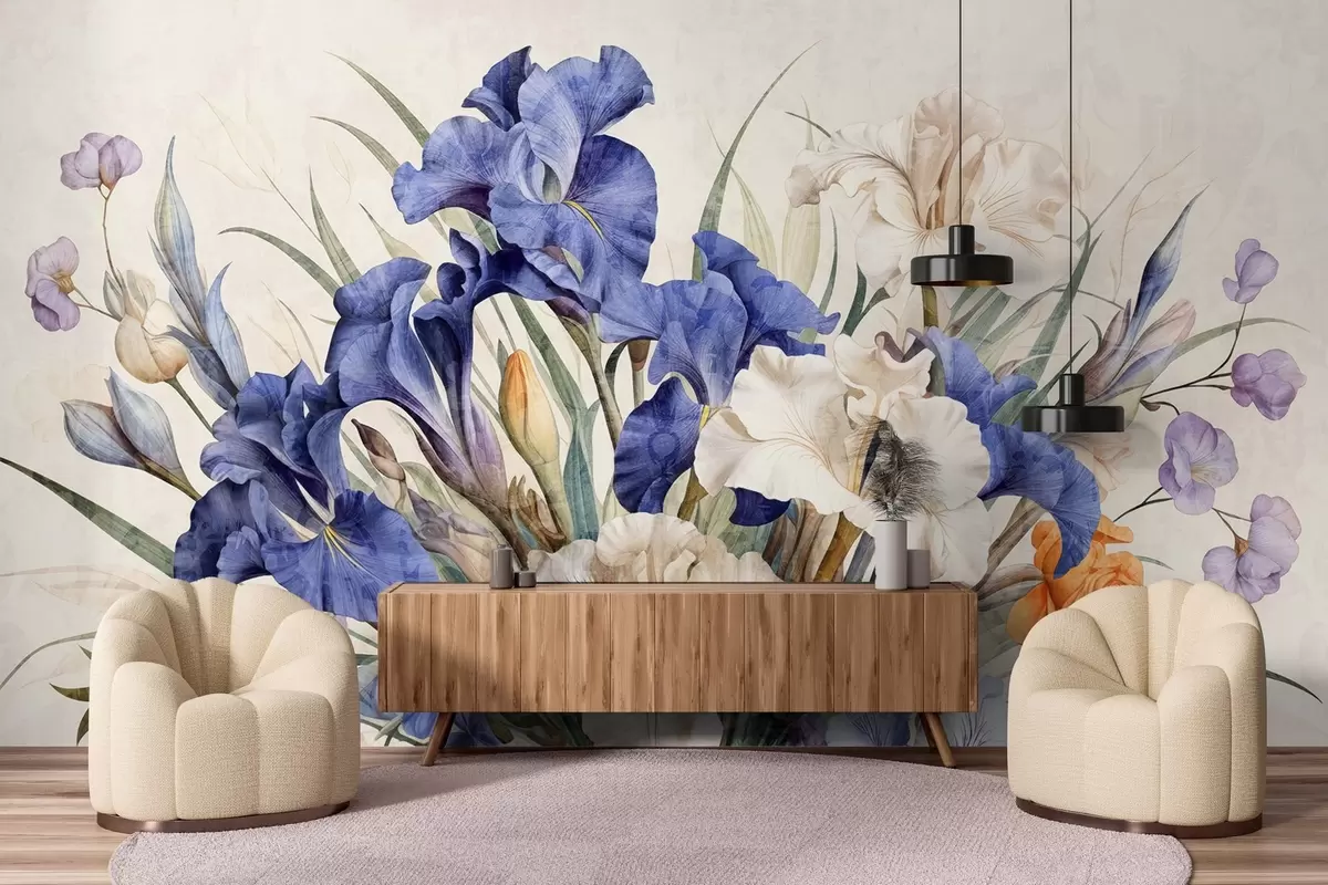 Papier peint Bouquet vintage texturé d'iris violets, arrangés avec des feuilles et des tiges vertes, sur un fond doux N° w09263