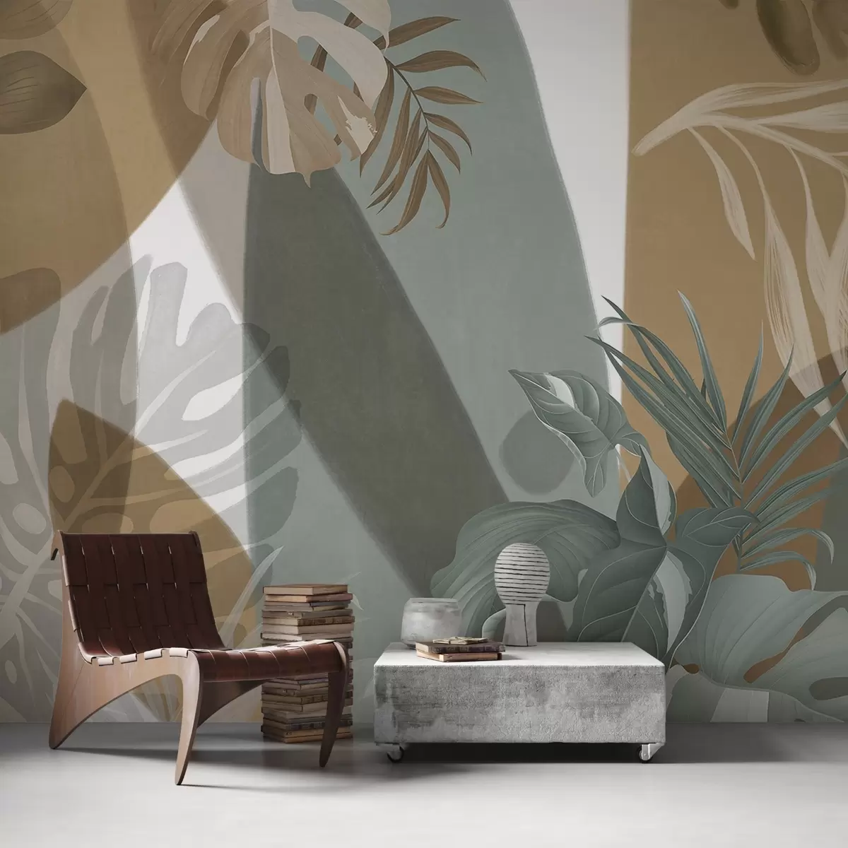 Papier peint Feuilles de monstera et feuilles de palmier dans un motif aux couleurs brunes, blanches et vertes, ambiance tropicale, formes abstraites, décoratif N° w09288
