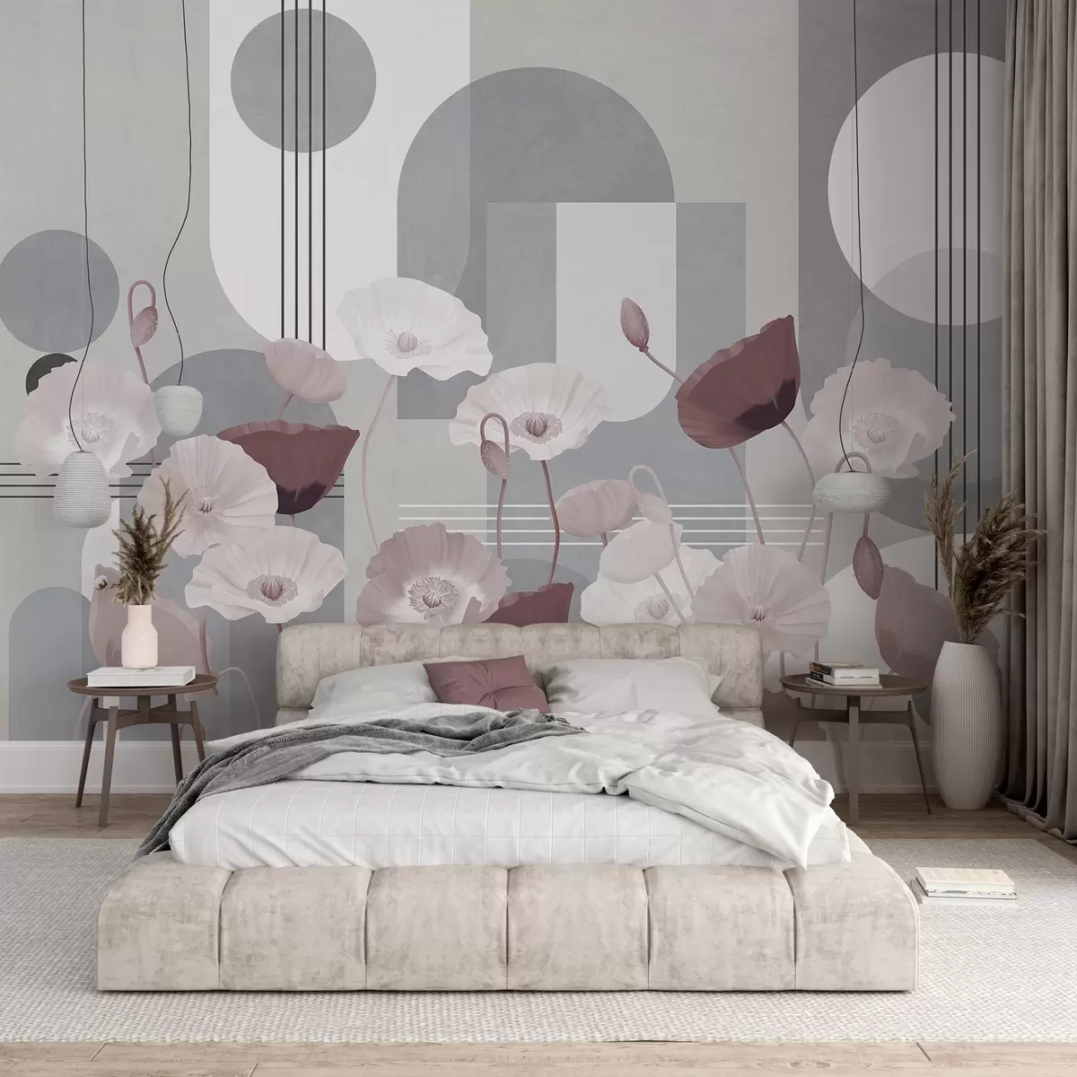 Papier peint Coquelicots en blanc et gris avec des formes géométriques en arrière-plan, des cercles et des arcs, style minimaliste, couleurs douces N° w09289v1