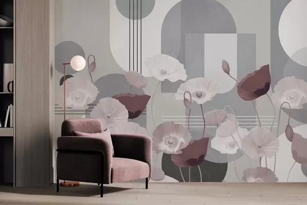 Papier peint Coquelicots en blanc et gris avec des formes géométriques en arrière-plan, des cercles et des arcs, style minimaliste, couleurs douces N° w09289v1