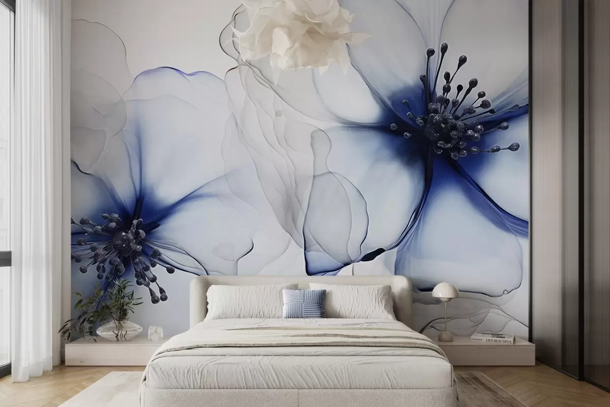 Papier peint Deux fleurs bleues translucides texturées avec des étamines visibles, des pétales délicats qui se chevauchent et une texture douce et fluide N° w09295v1