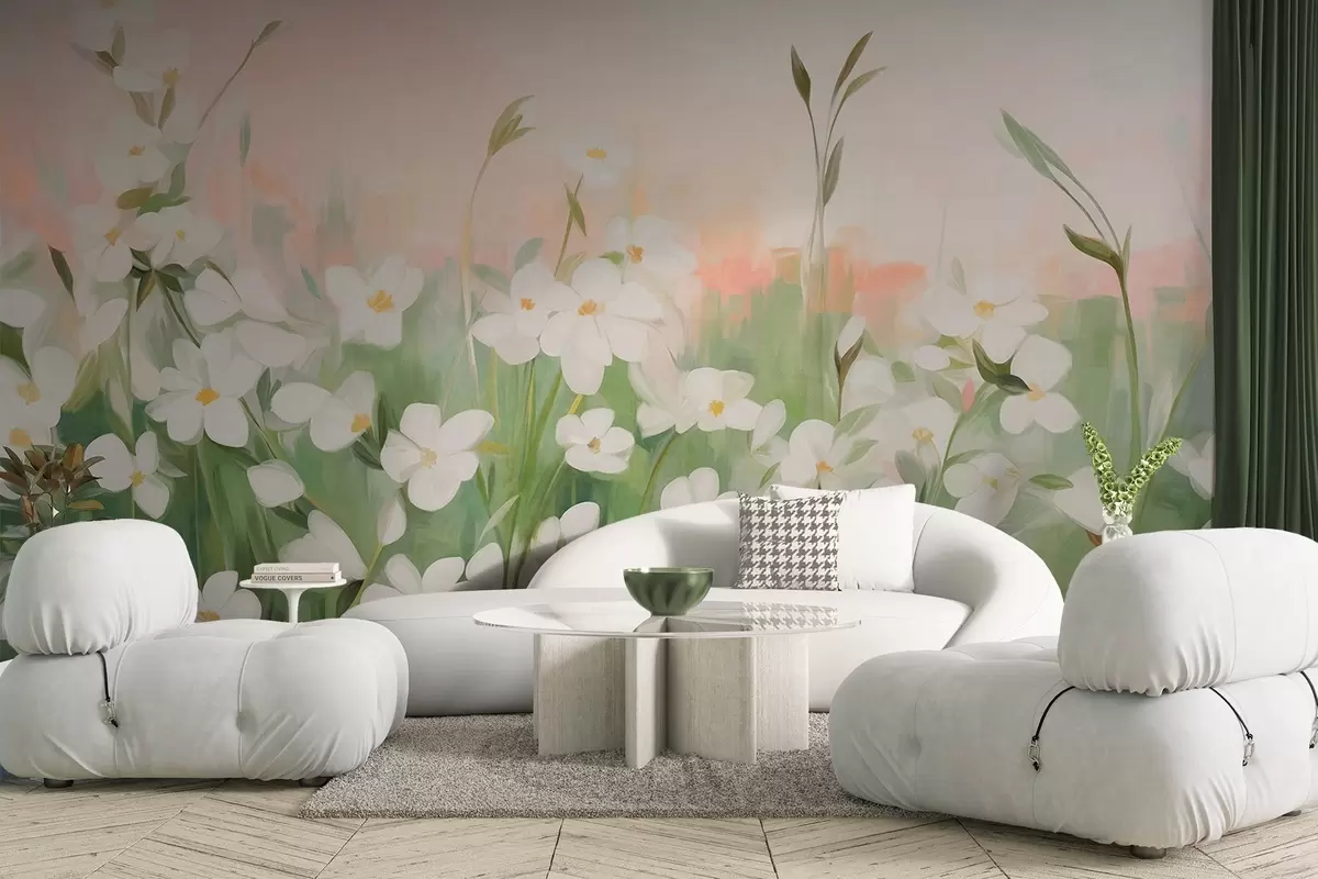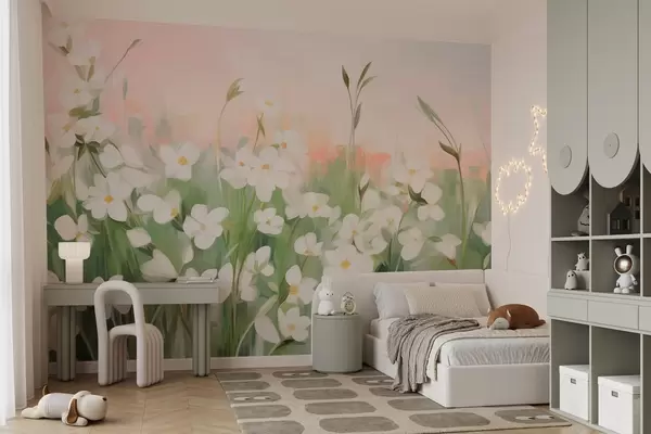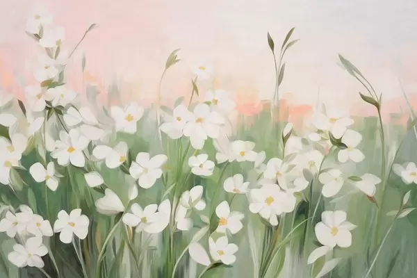 Papier peint Champ abstrait de fleurs sauvages aux tiges et feuilles vertes, sur fond de ciel texturé rose pâle et blanc. N° w09297