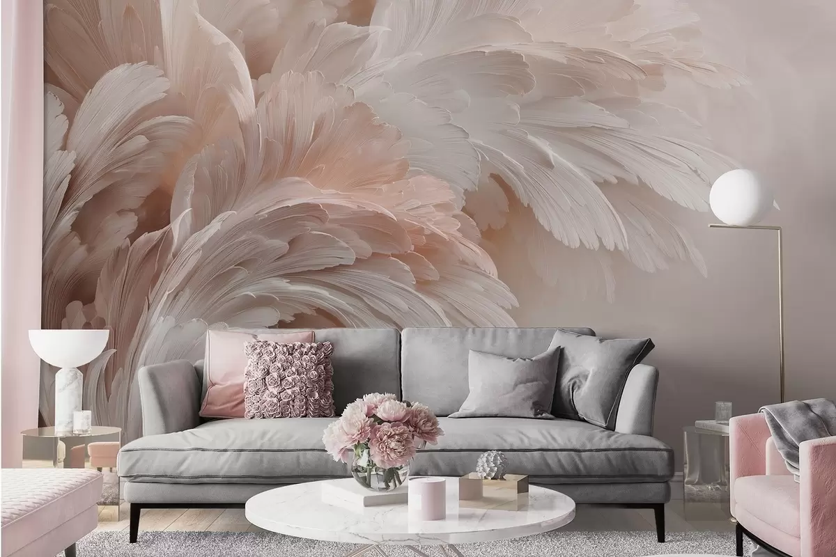 Papier peint Plumes et pétales aériens dans des tons rose crème N° w09301