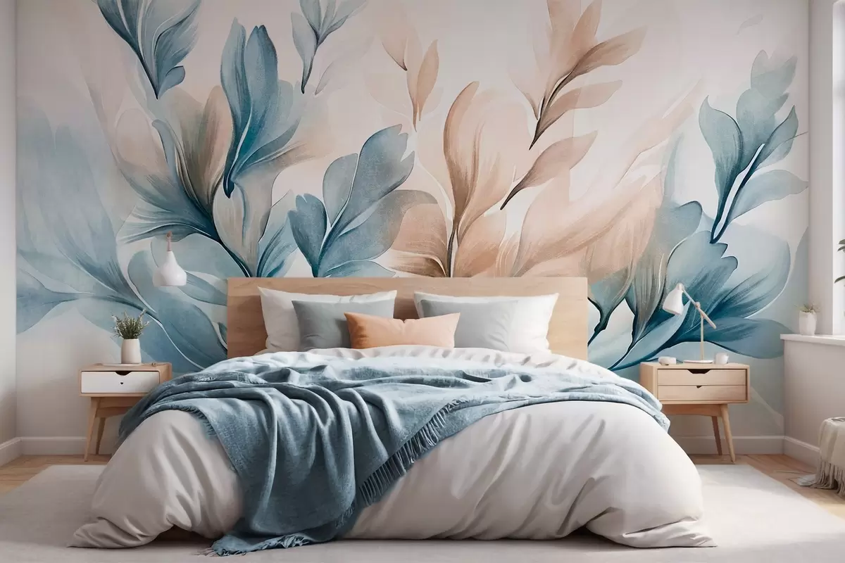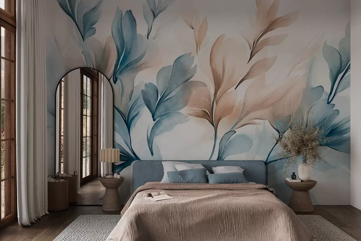Papier peint Feuilles abstraites bleues et brunes avec des coups de pinceau visibles, légères et texturées, palette de couleurs douces, effet aquarelle N° w09313