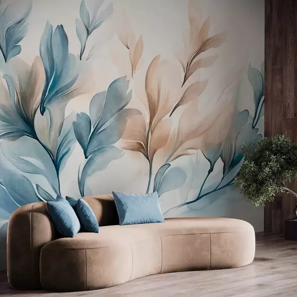 Papier peint Feuilles abstraites bleues et brunes avec des coups de pinceau visibles, légères et texturées, palette de couleurs douces, effet aquarelle N° w09313