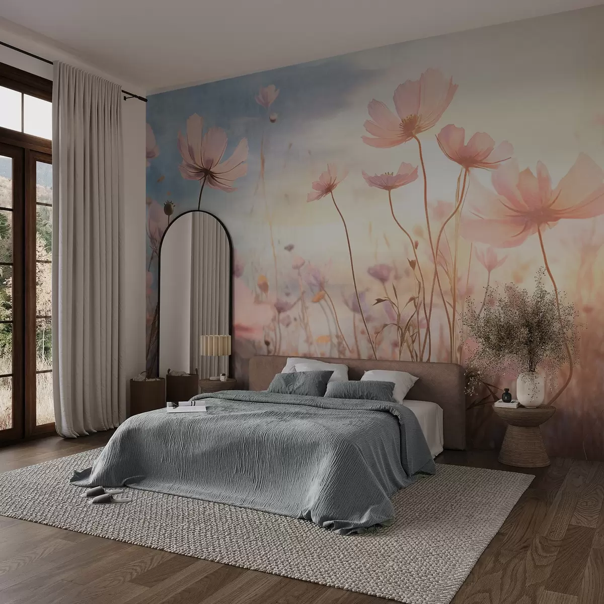 Papier peint Un champ de fleurs roses texturées aux longues tiges, sur fond de ciel bleu et jaune, créant une atmosphère de rêve N° w09320