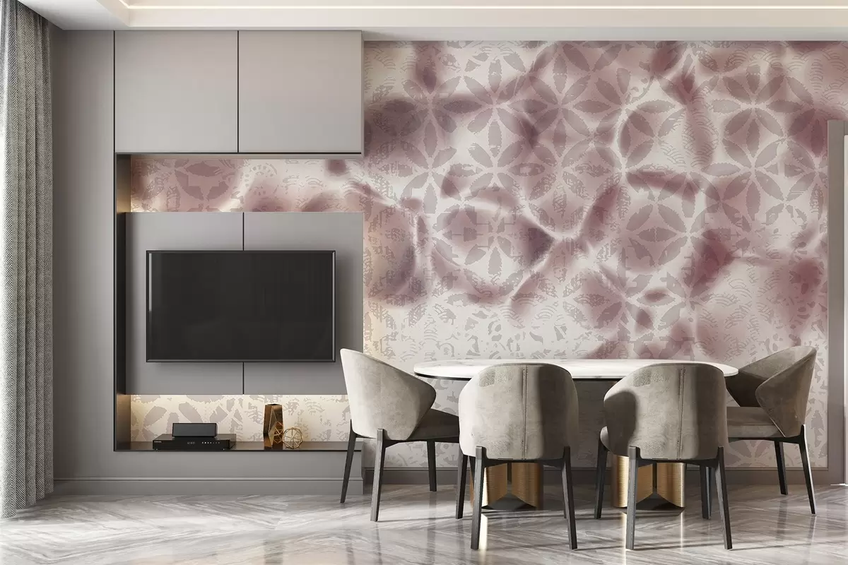 Papier peint Art abstrait texturé avec imprimé floral bordo, effet délavé et flou, créant une atmosphère douce et rêveuse N° w09322v1