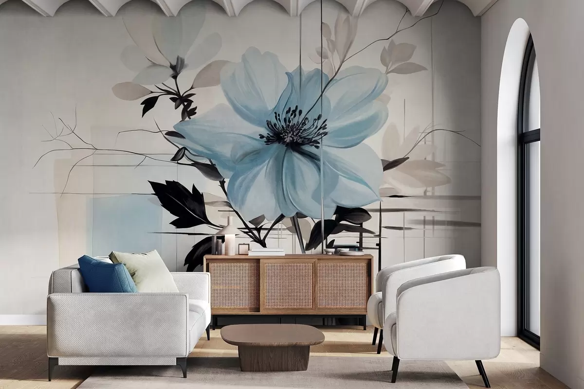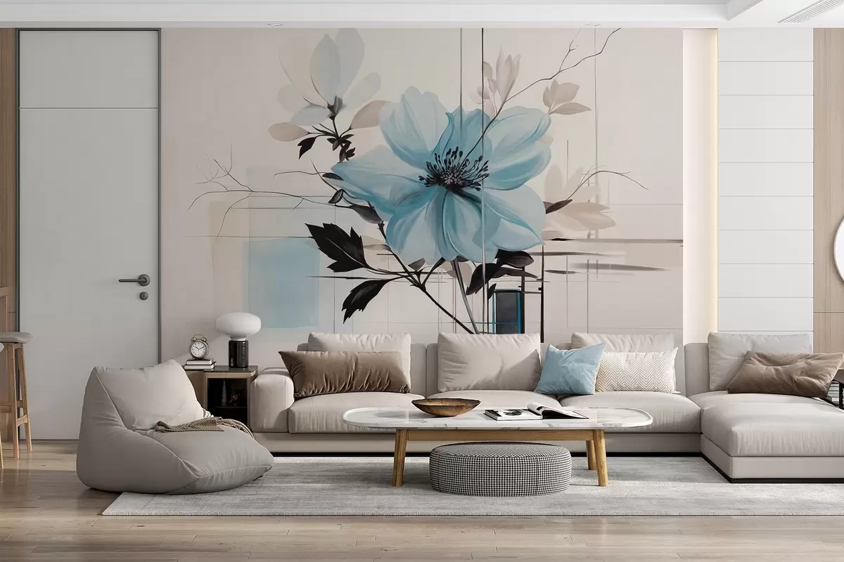 Papier peint Fleur bleue abstraite texturée avec des feuilles et des branches sombres, des formes géométriques minimalistes et des lignes dans des couleurs sourdes N° w09332