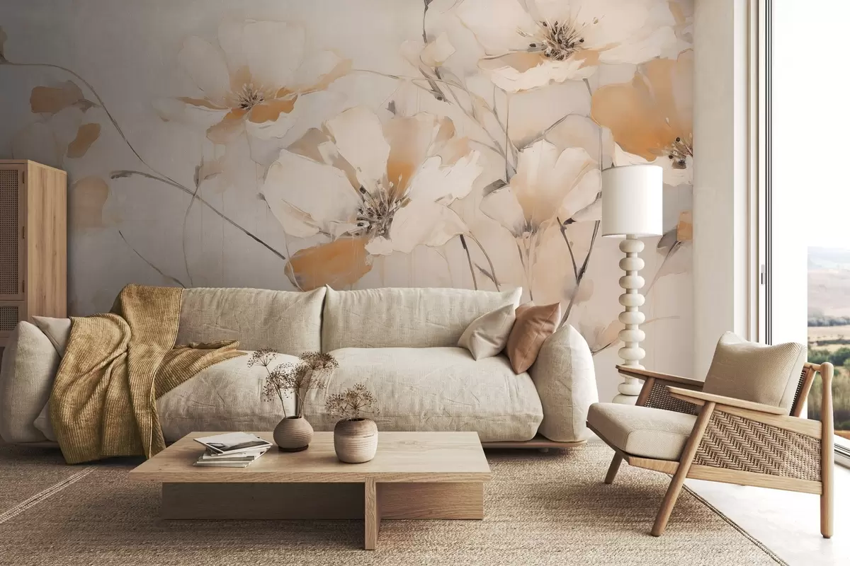 Papier peint Fleurs blanches et orange texturées avec de longues tiges, fond clair, couleurs douces, composition élégante, coups de pinceau délicats N° w09335