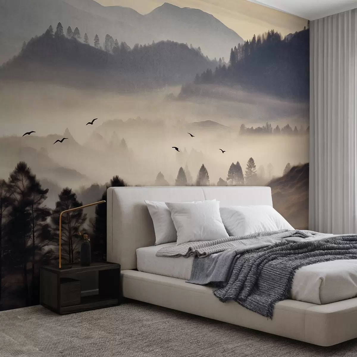 Papier peint Paysage de montagne texturé avec des couches de brouillard, arbres silhouettés au premier plan, chaîne de montagnes lointaine, éclairage doux N° w09338
