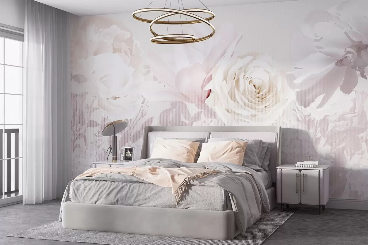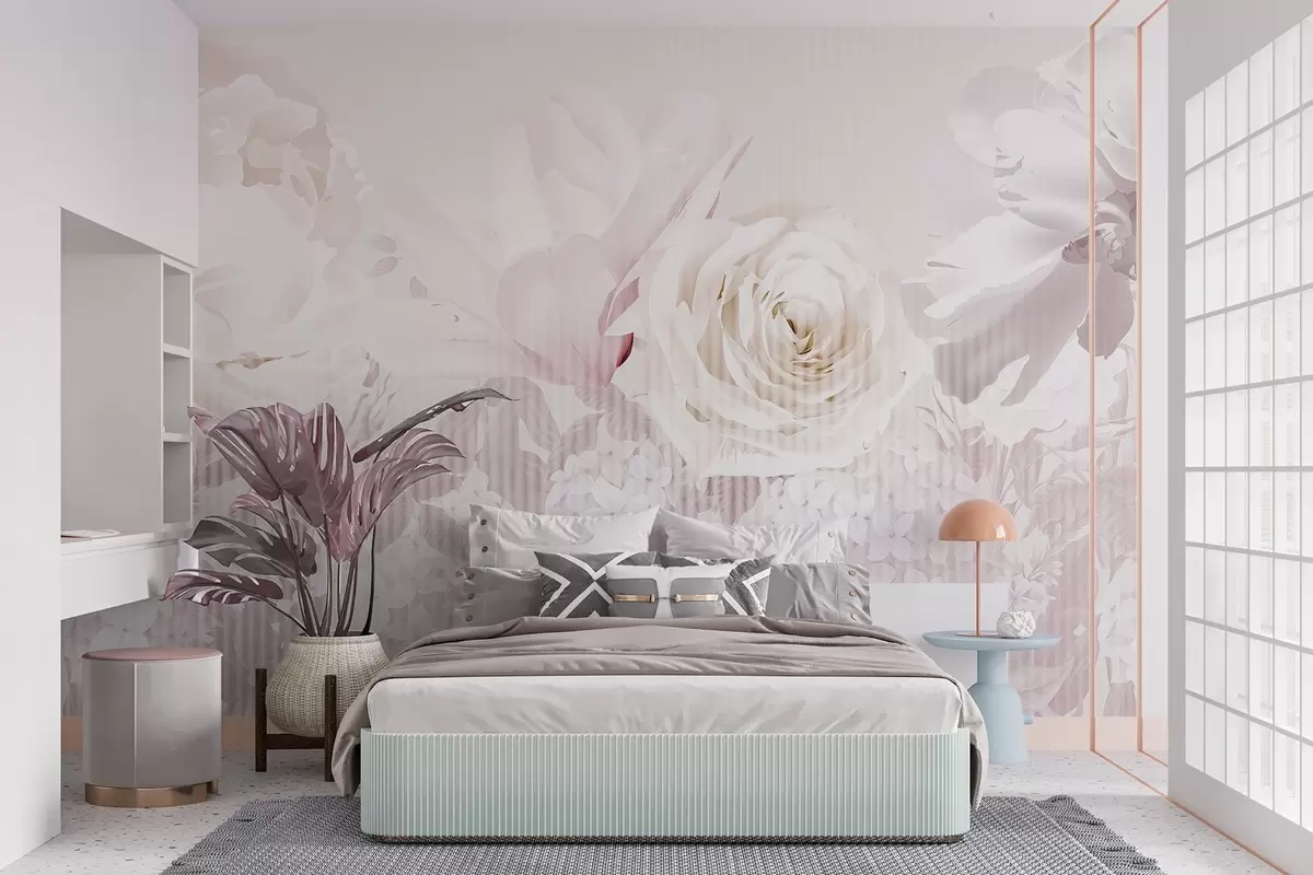 Papier peint Arrangement floral composé de roses, d'hortensias et de tulipes dans des tons doux et pastel de blanc, rose et beige, avec une texture rayée N° w09340
