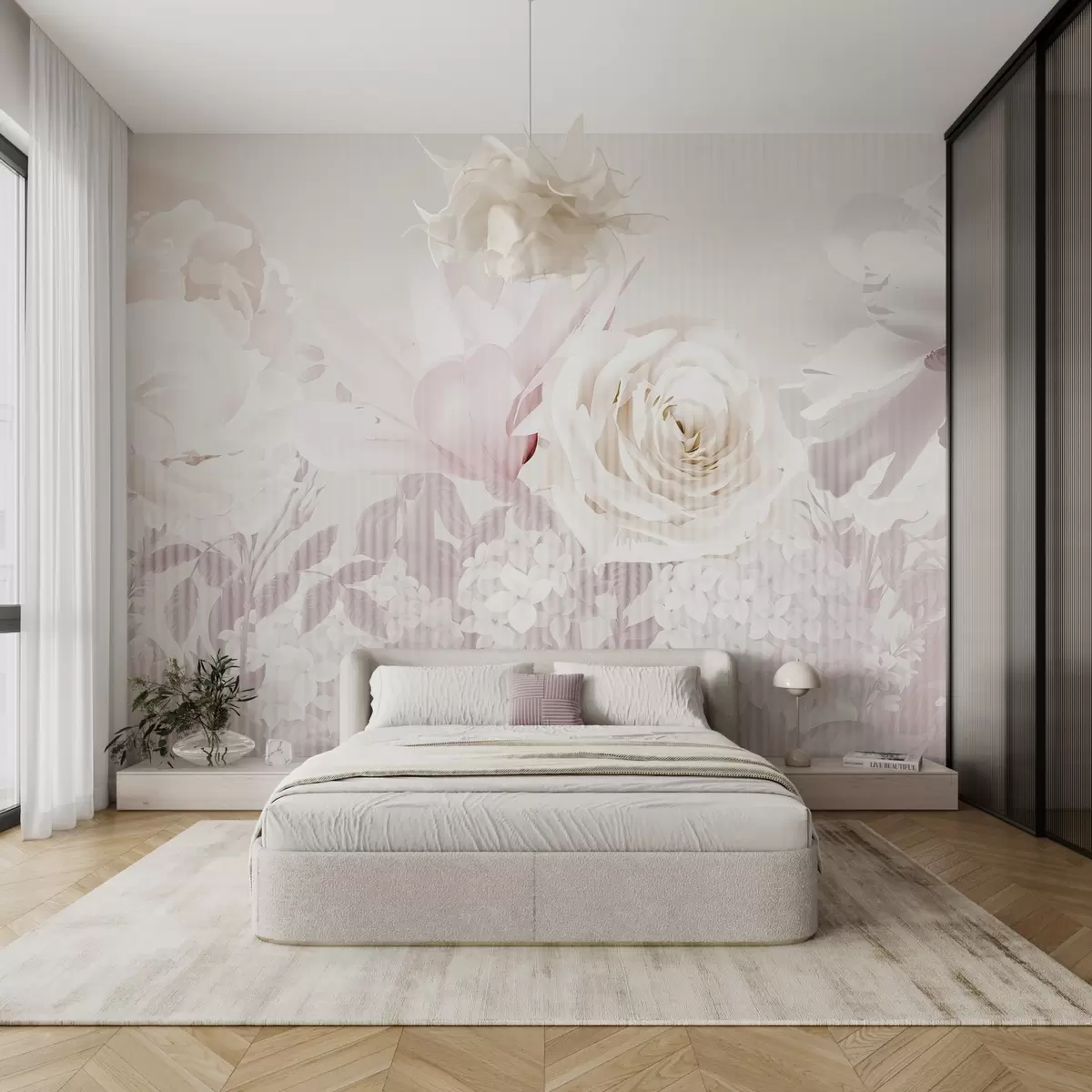 Papier peint Arrangement floral composé de roses, d'hortensias et de tulipes dans des tons doux et pastel de blanc, rose et beige, avec une texture rayée N° w09340