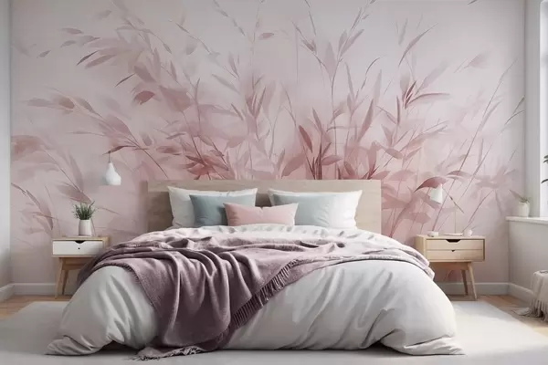 Papier peint Herbe et mauvaises herbes avec des feuilles et des tiges fines, couleurs roses claires, coups de pinceau doux et délicats, impression minimaliste N° w09342v2