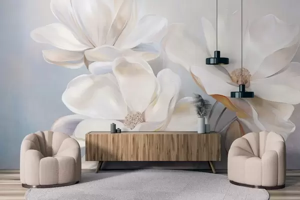 Papier peint Fleurs de magnolia blanches fantaisistes aux pétales délicatement texturés, sur fond abstrait et doux. N° w09373