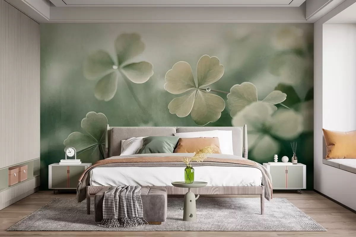 Papier peint Trèfle à quatre feuilles avec gouttes d'eau, couleur vert clair, mise au point douce, arrière-plan flou, impression texturée N° w09376