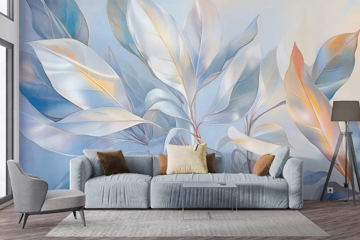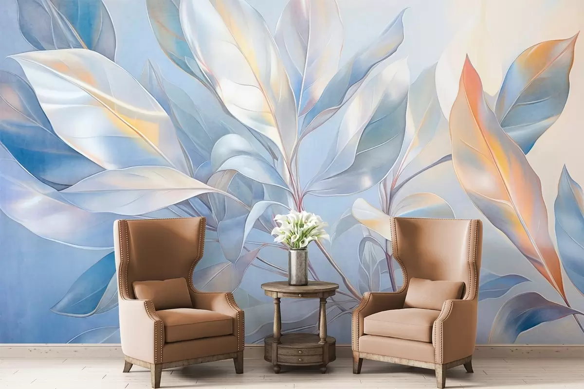 Papier peint Feuilles de magnolia aux tons blancs et bleus, éclairage doux, composition élégante, détails des nervures des feuilles, coups de pinceau artistiques N° w09385