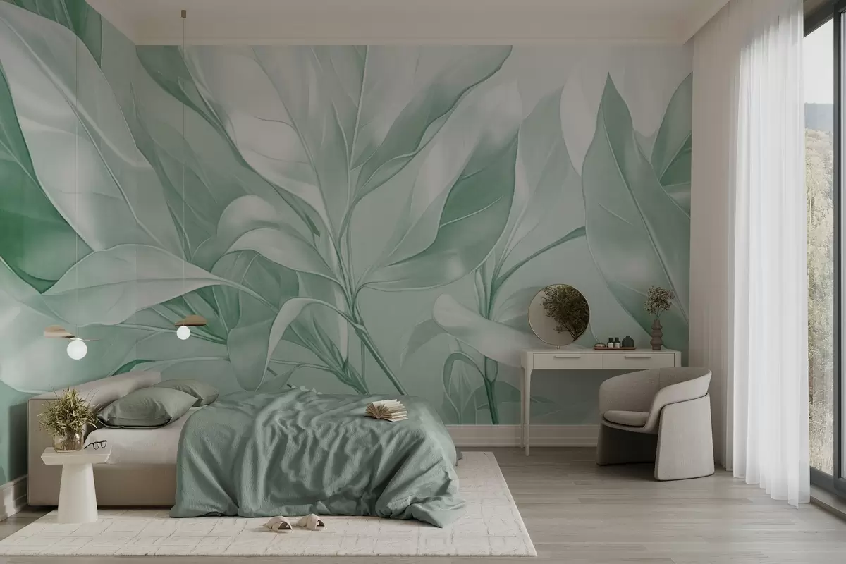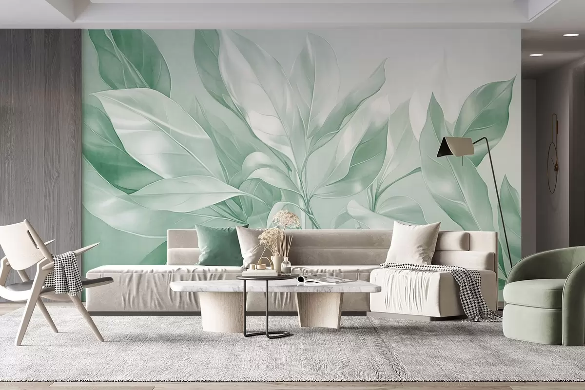 Papier peint Feuilles de magnolia aux tons blancs et verts, éclairage doux, composition élégante, détails des nervures des feuilles, coups de pinceau artistiques N° w09385v1