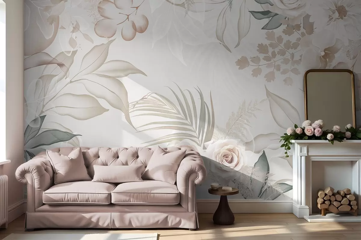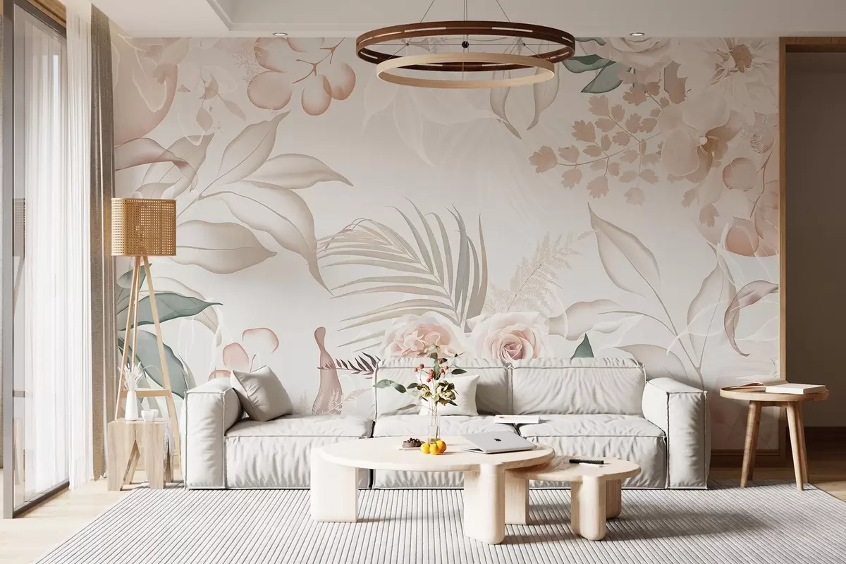 Papier peint Composition florale texturée avec roses, orchidées, eucalyptus et feuilles de palmier dans des tons pastel, fond beige N° w09393