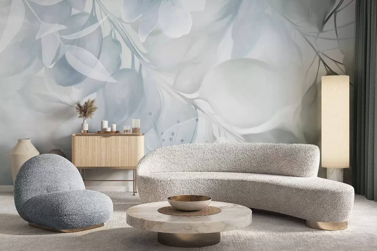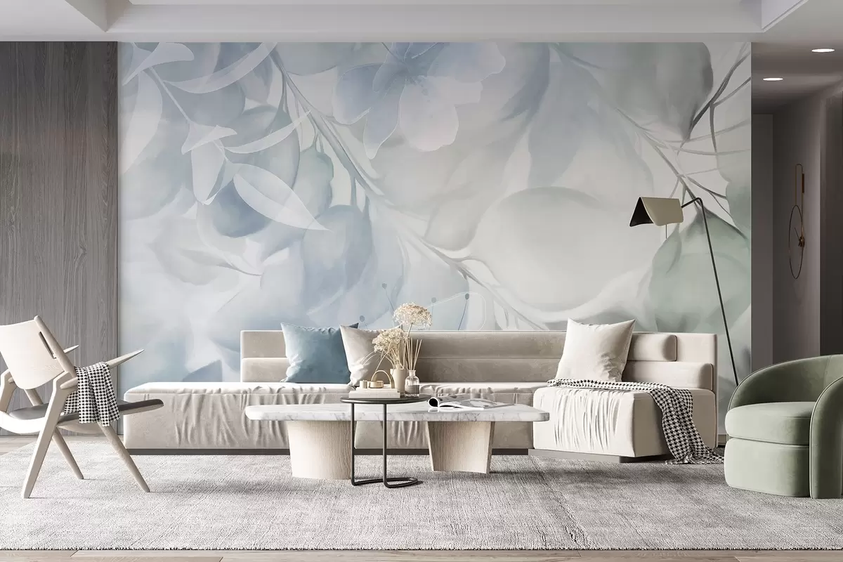 Papier peint Art floral avec des fleurs, des feuilles et des branches dans des tons bleus et verts discrets, des couleurs pastel douces et un effet aquarelle texturé N° w09397v1
