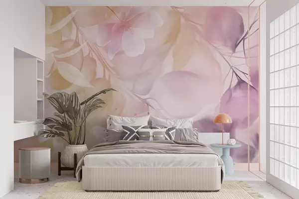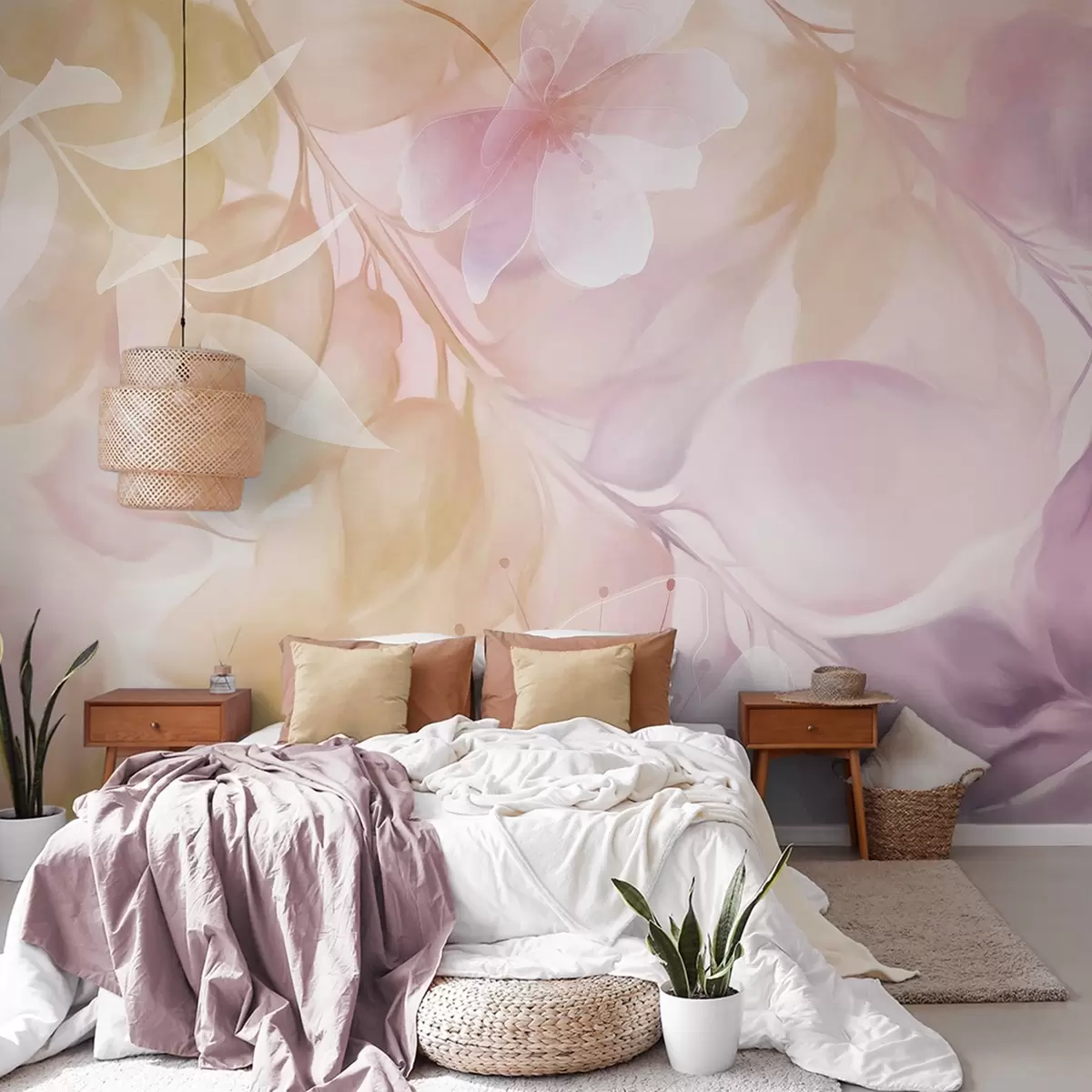 Papier peint Art floral avec des fleurs, des feuilles et des branches aux tons jaunes et violets discrets, couleurs pastel douces, effet aquarelle texturé N° w09397v2