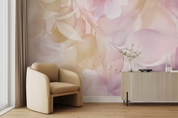 Papier peint Art floral avec des fleurs, des feuilles et des branches aux tons jaunes et violets discrets, couleurs pastel douces, effet aquarelle texturé N° w09397v2