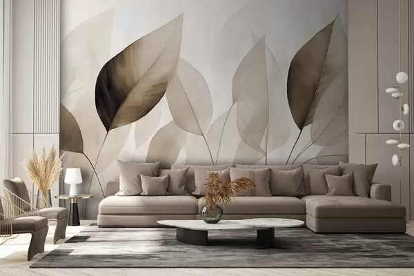 Papier peint Peinture texturée imitant des feuilles dans des tons bruns et beiges, avec des nervures et des tiges délicates N° w09400v1
