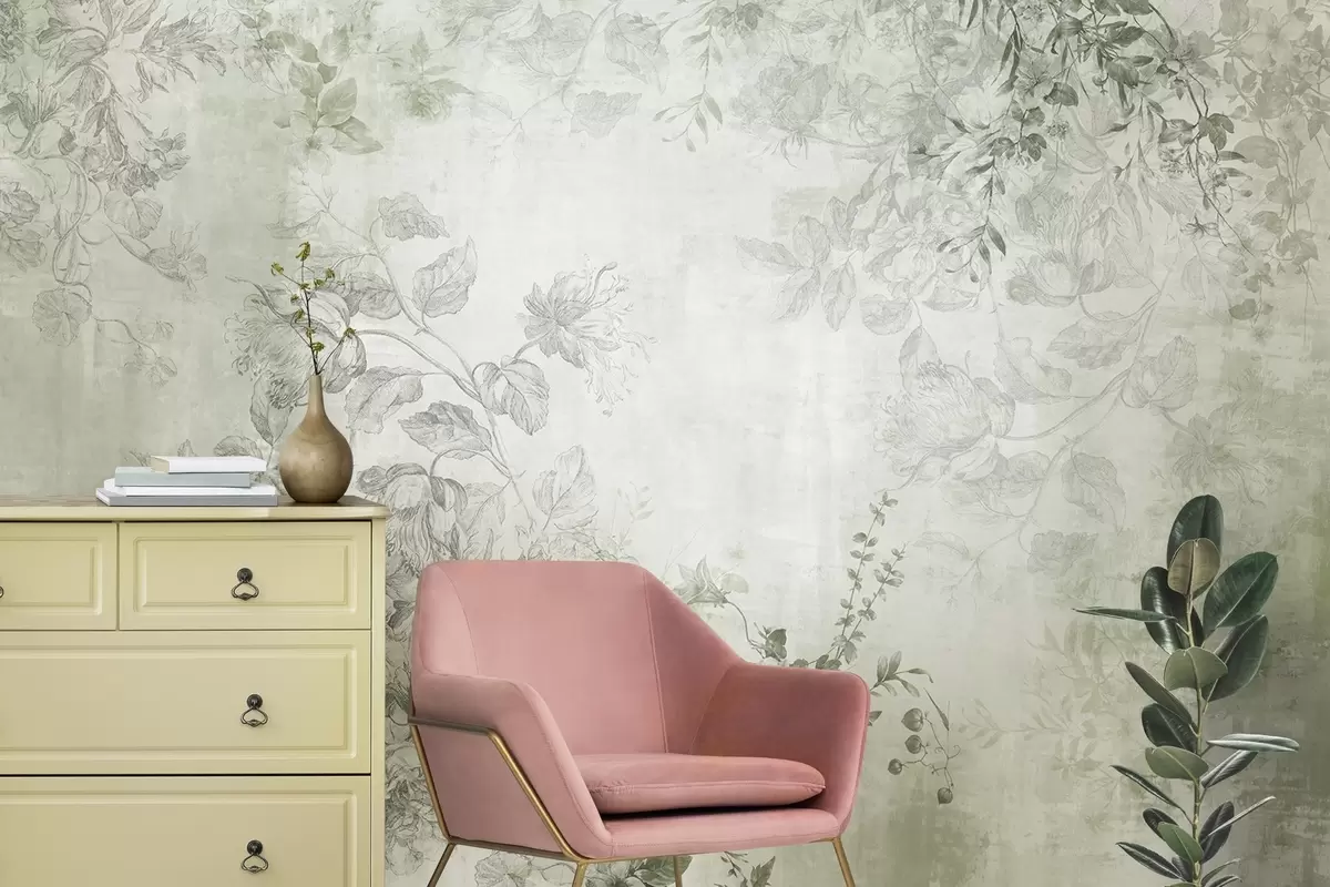 Papier peint Art floral vintage texturé avec des illustrations délicates de fleurs et de feuilles de jardin dessinées, dans des tons verts doux N° w09402v2