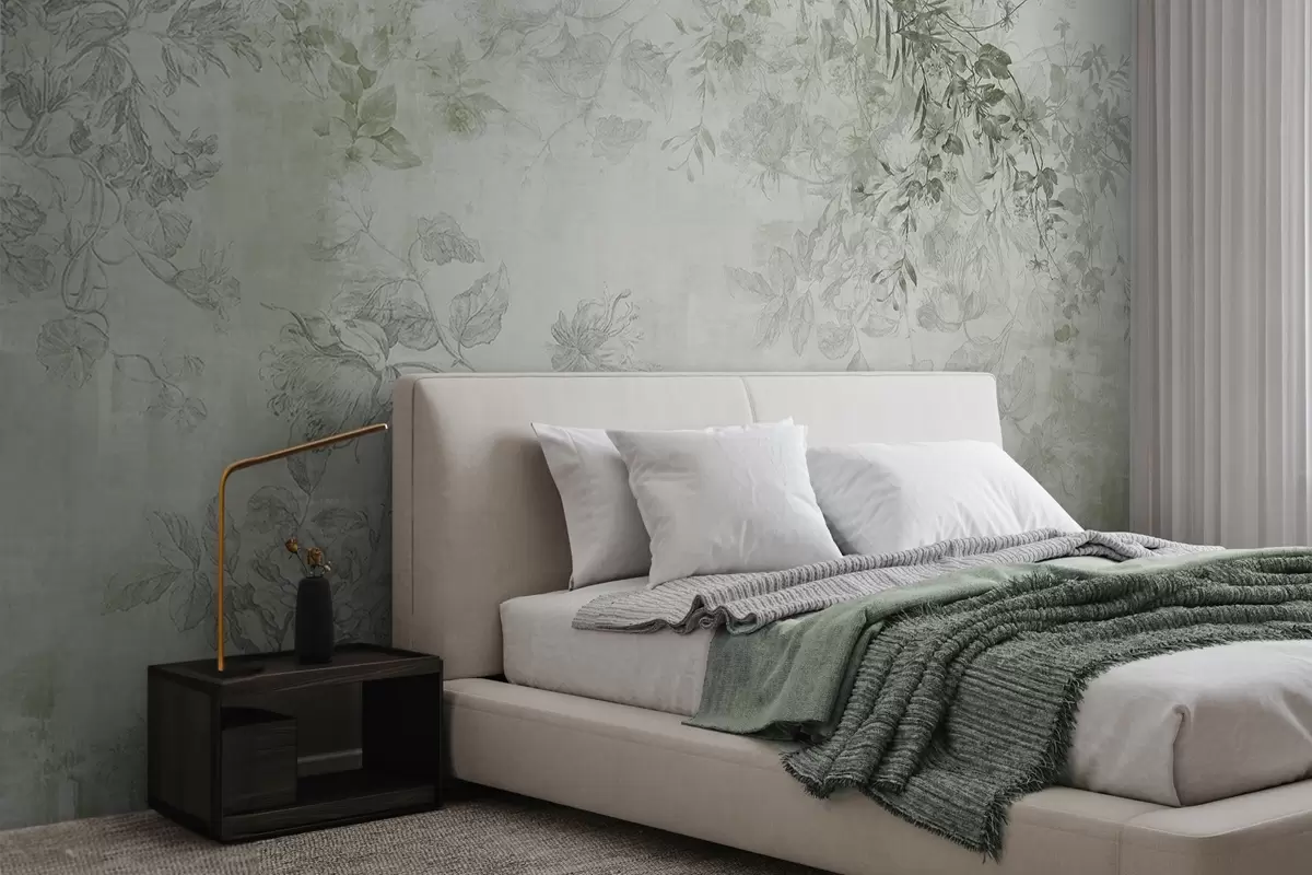 Papier peint Art floral vintage texturé avec des illustrations délicates de fleurs et de feuilles de jardin dessinées, dans des tons verts doux N° w09402v2