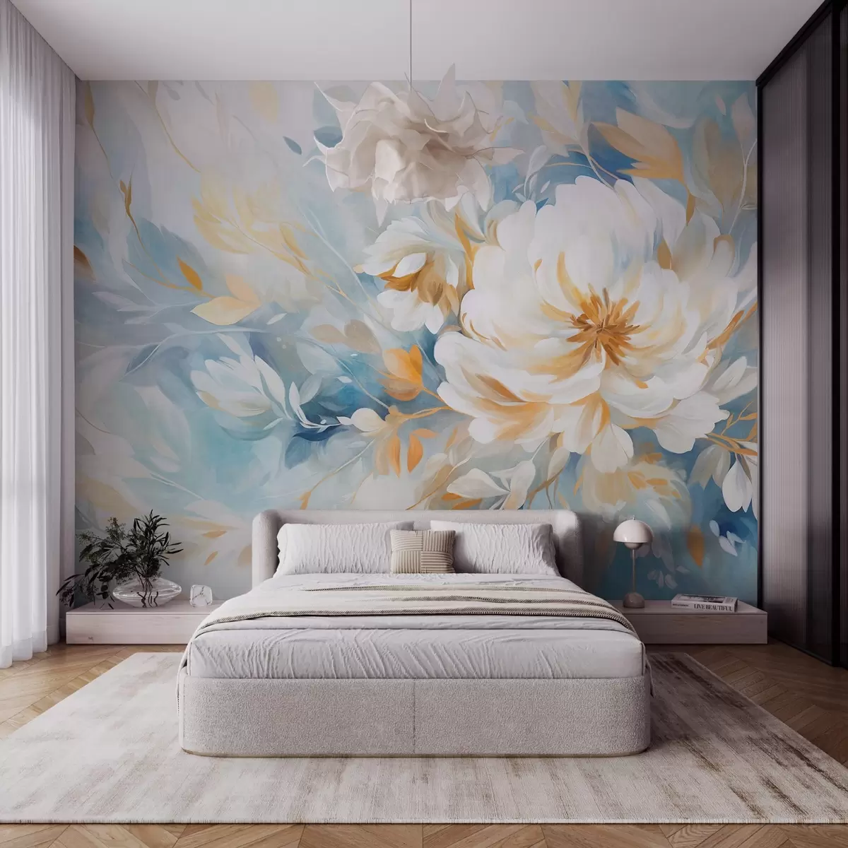 Papier peint Fleur blanche texturée avec des détails bleus et jaunes et des feuilles sur un fond abstrait bleu et blanc, style peinture N° w09403