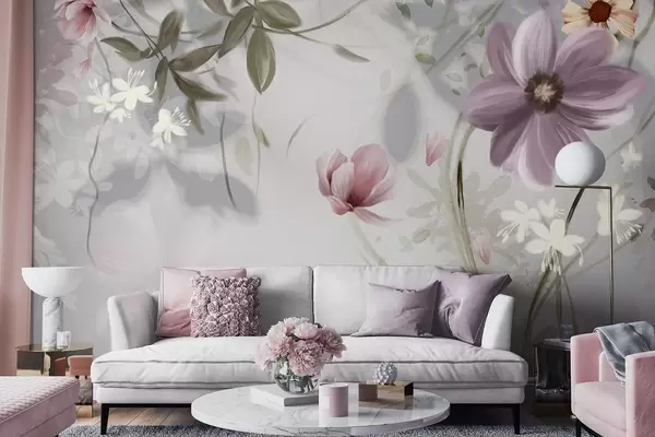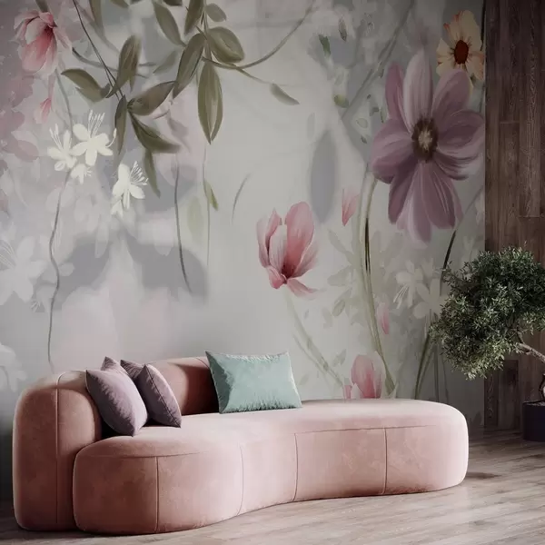 Papier peint Fleurs roses et blanches avec tiges et feuilles vertes, éclairage tamisé, couleurs douces, composition florale N° w09417v1