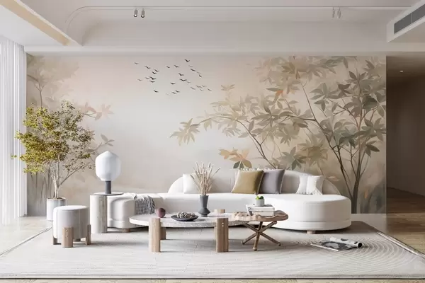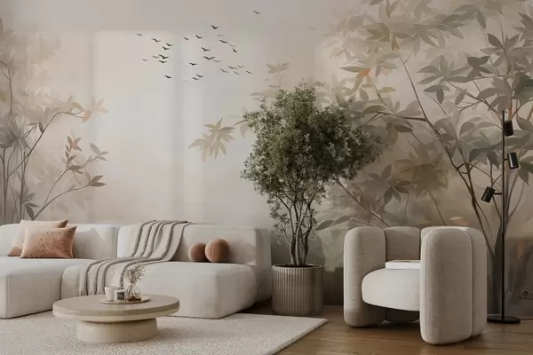 Papier peint Paysage texturé avec des arbres et une volée d'oiseaux volant dans le ciel, couleurs pastel, scène naturelle N° w09418