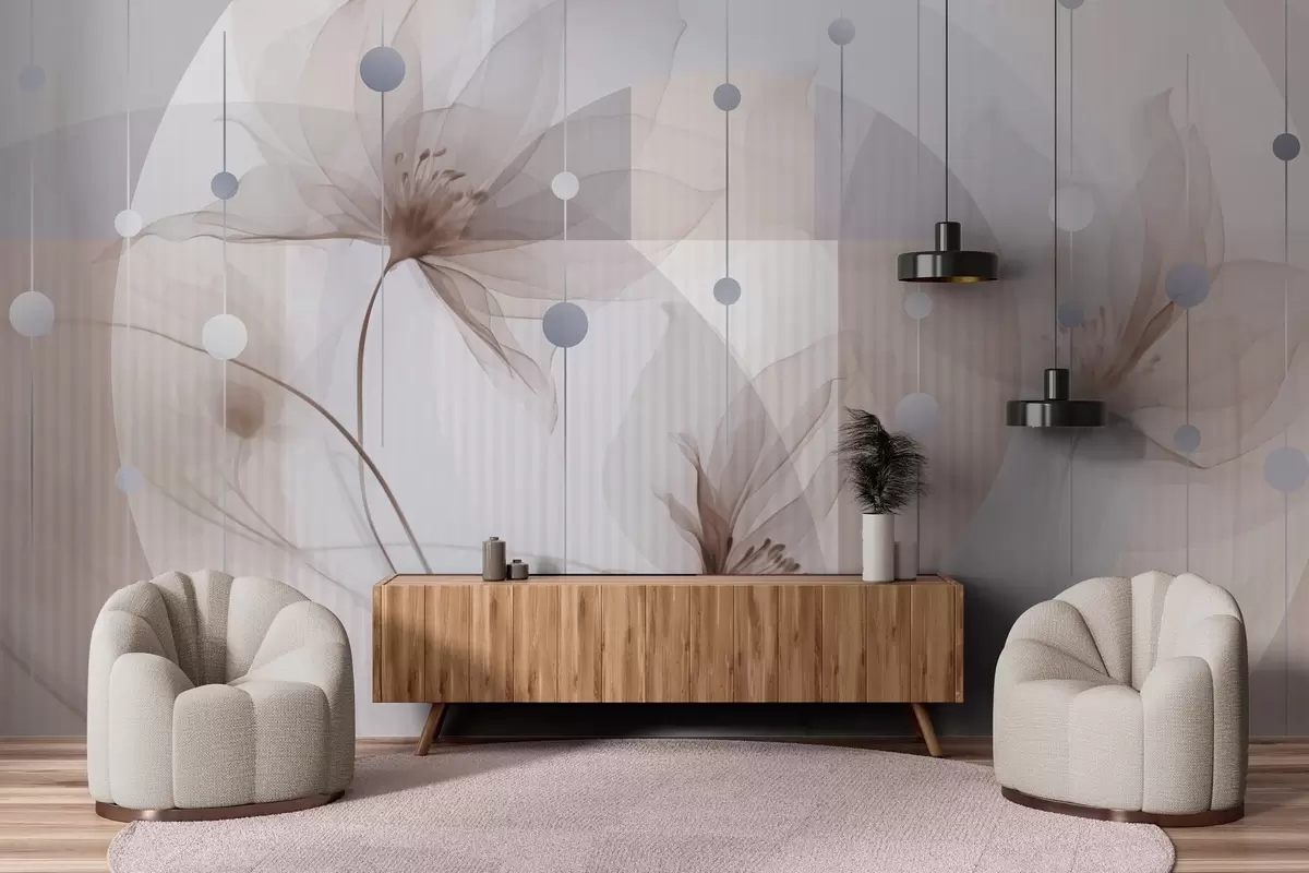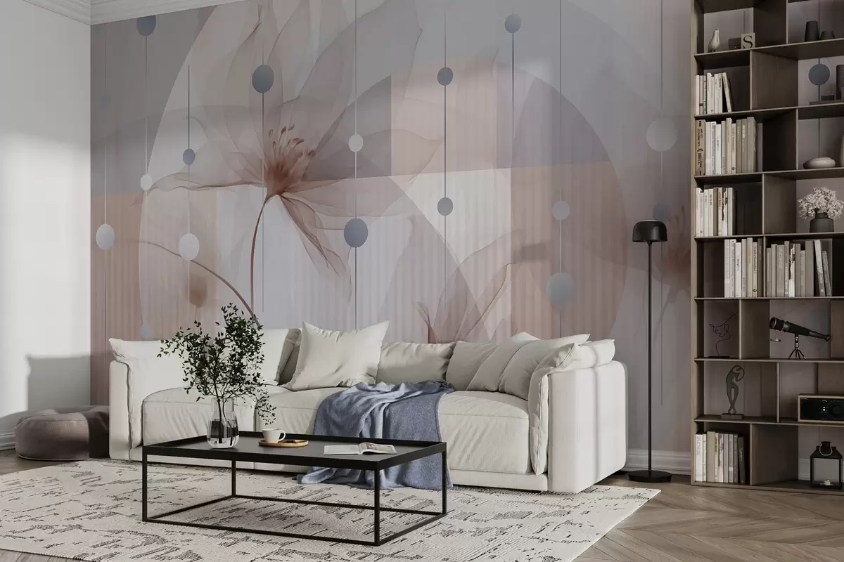 Papier peint Fleurs abstraites translucides, cercles et formes géométriques, palette de couleurs bleu pastel, marron et blanc N° w09419v1